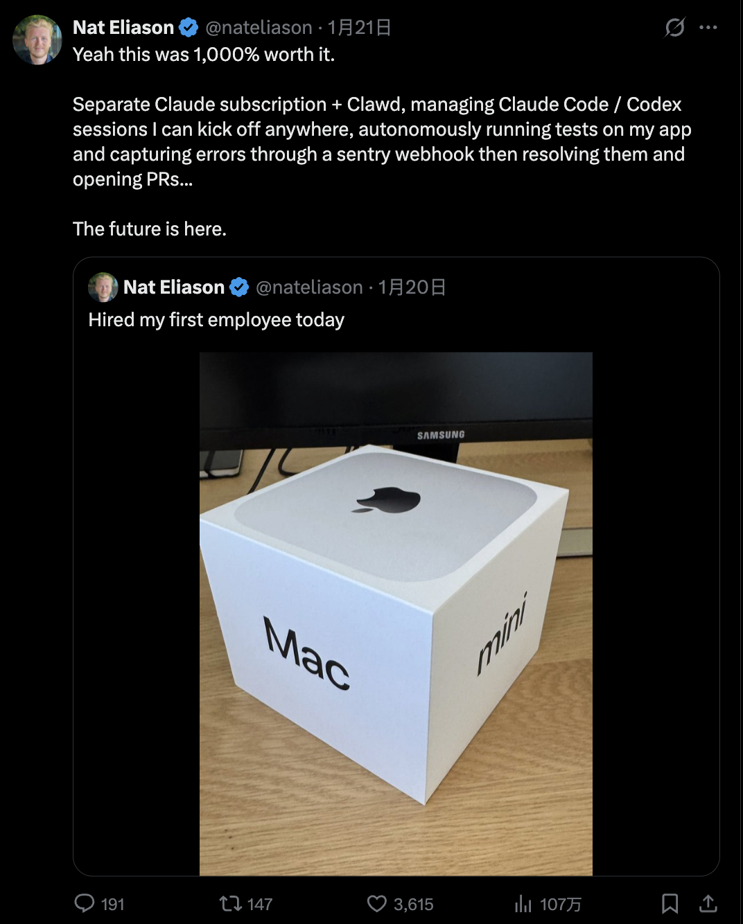 “这东西值爆了… 它可以帮我自动跑测试,捕捉 Sentry 报错,然后自动修复 Bug 甚至提 PR… 未来已来 (The future is here)。”